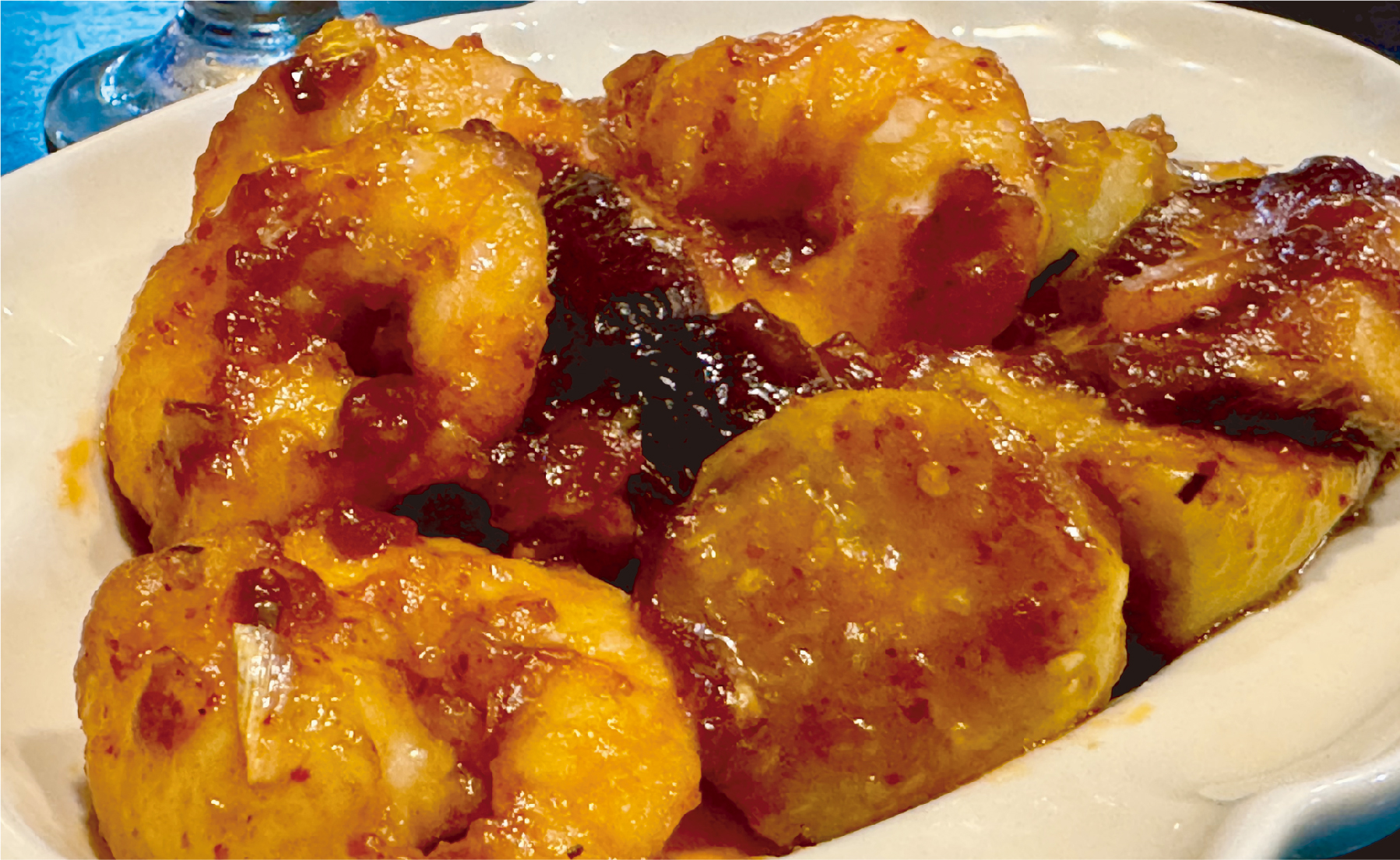 どデカいエビがブリンブリンで旨い!エビだけじゃなく、こだわりの椎茸・茄子も良い仕事しています。想像よりも辛さは強めで、ビール一杯では足りず、2杯目にハイボールいってしまいました。