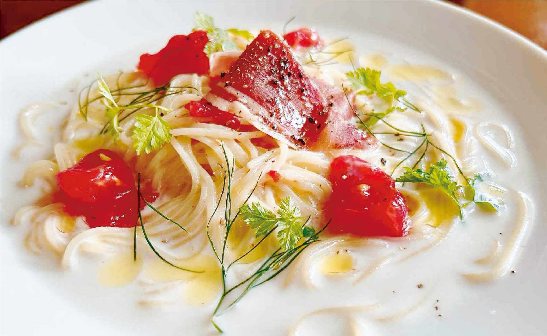 マンジャーレ TAKINAMI味はもちろん、見た目も美しい冷製スパゲティ。クリーミーなじゃがいもの冷製スープ&完熟トマト、そして、生ハムはなんと自家製! ヴィシソワーズのスパゲティは9月末で終了なので、お早めに!