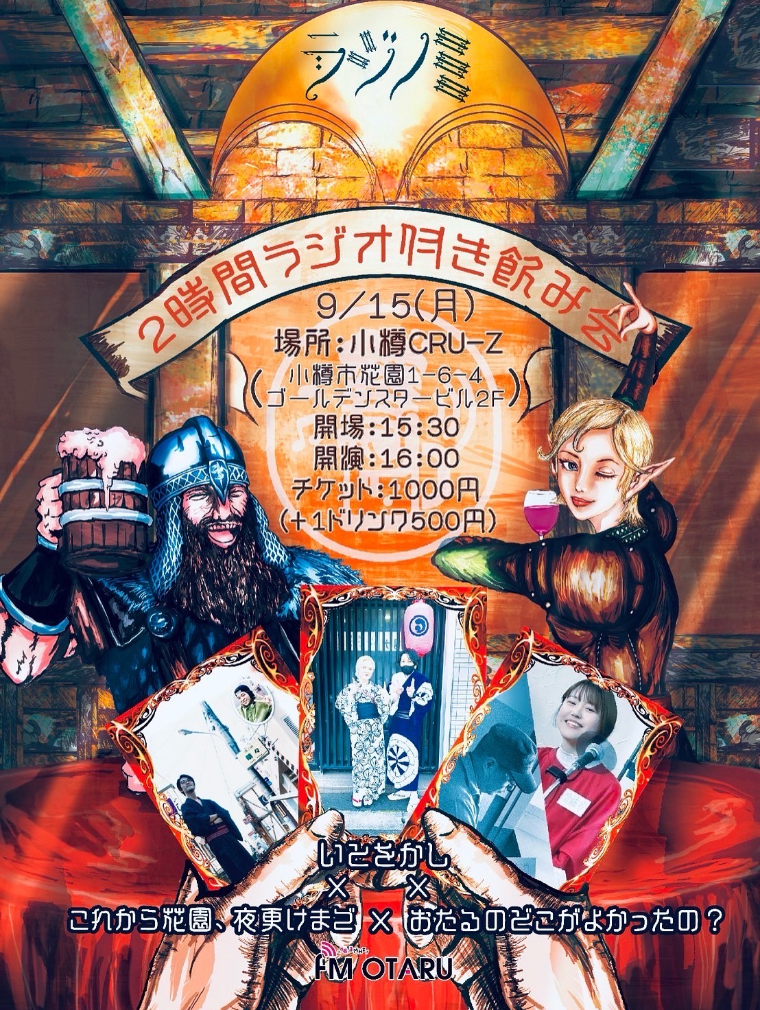 メロウさんのお二人のラジオ番組(FMおたる)「いとをかし」と、「おたるのどこがよかったの?」「これから花園、夜更けまで…」の3番組合同の公開収録が開催されます。パーソナリティ6人によるトークをお楽しみください。9/15(月)16時〜、チケット1,000円(+1ドリンク500円)。@小樽 Cru-z(花園1-6-3 ゴールデンスタービル2F)