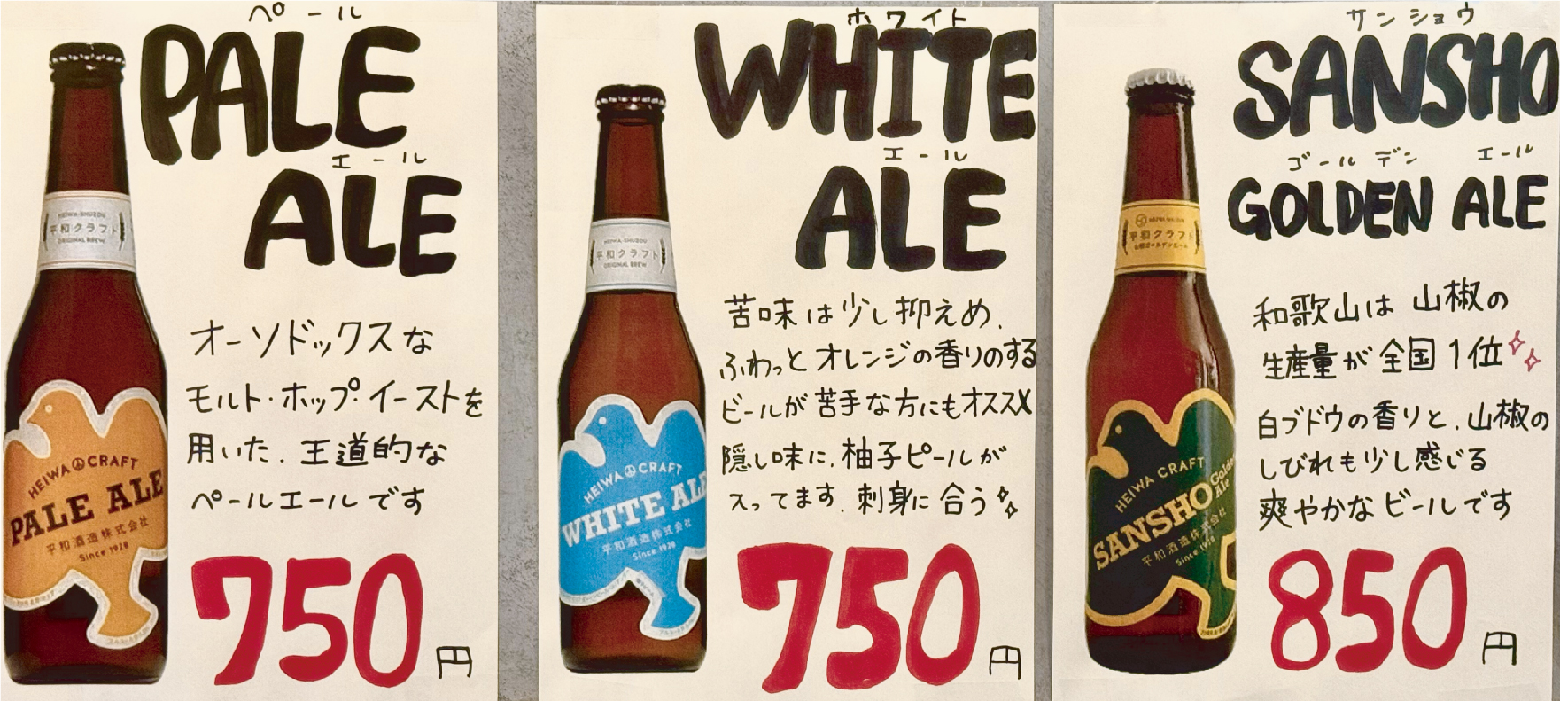 先月のたるぽん企画に登場した「平和クラフトビール」が、大好評につき、何と!レギュラーメニュー入りです。日本酒の酒蔵が作ったビールで、それぞれに特徴があるので、飲み比べてみると面白いです。