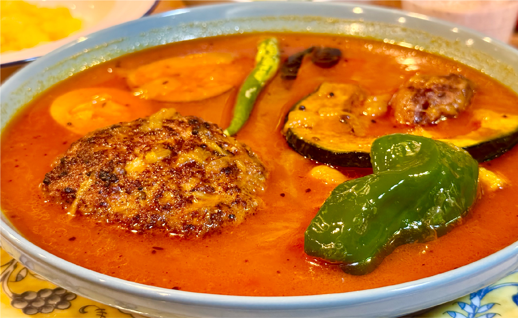 メイン具材のハンバーグは、余市北島農場の麦豚を使用、堂々の200g! さらさらスープとトロみのあるスープのどちらかを選べます。写真はトロみスープ。ターメリックライス・サラダ・フルーツラッシー付き。