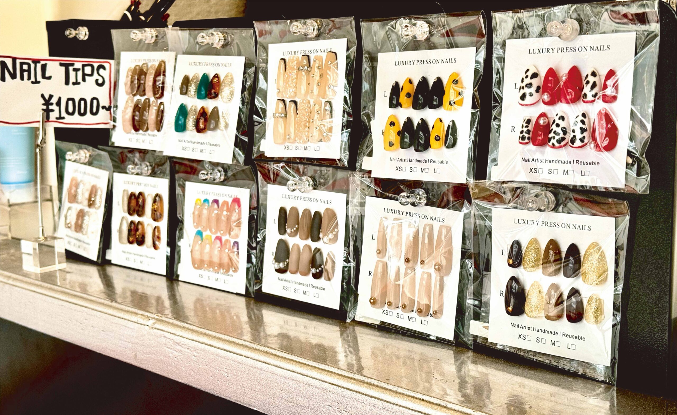 美容室メロウさんでは、手軽に楽しめるネイルチップも販売中。デザイン豊富で、オーダーも受け付けてくれます(要相談)。成人式や結婚式など、特別な日にも普段使いにも、指先のおしゃれを気軽に楽しめます。