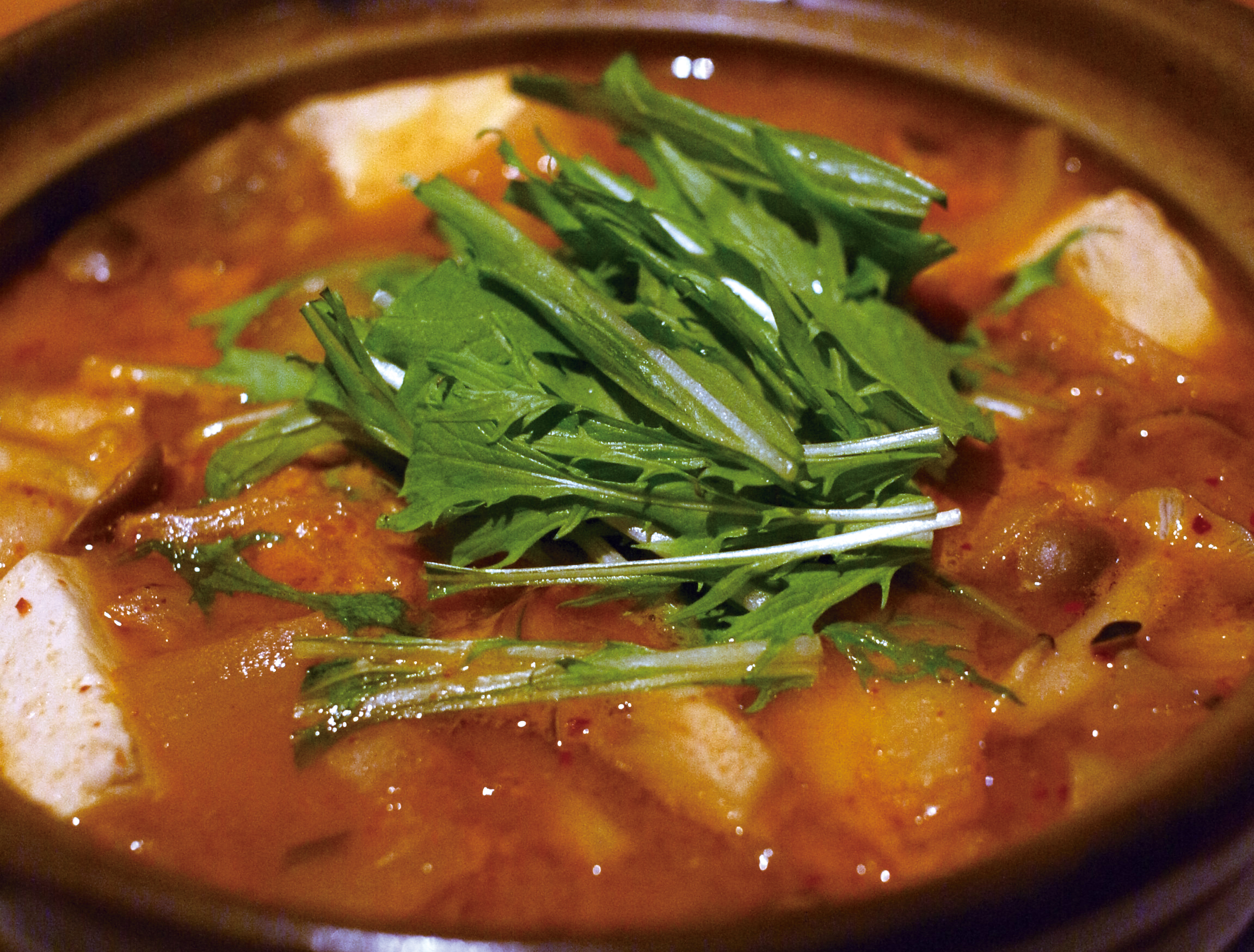 鶏ガラから数時間かけてとった出汁と「秘伝のチゲ味噌」が味の決め手。豚バラや野菜、うどんなど、具材も豊富。土鍋でグツグツあつあつで運ばれてきますよ!寒い日にはコレですね!