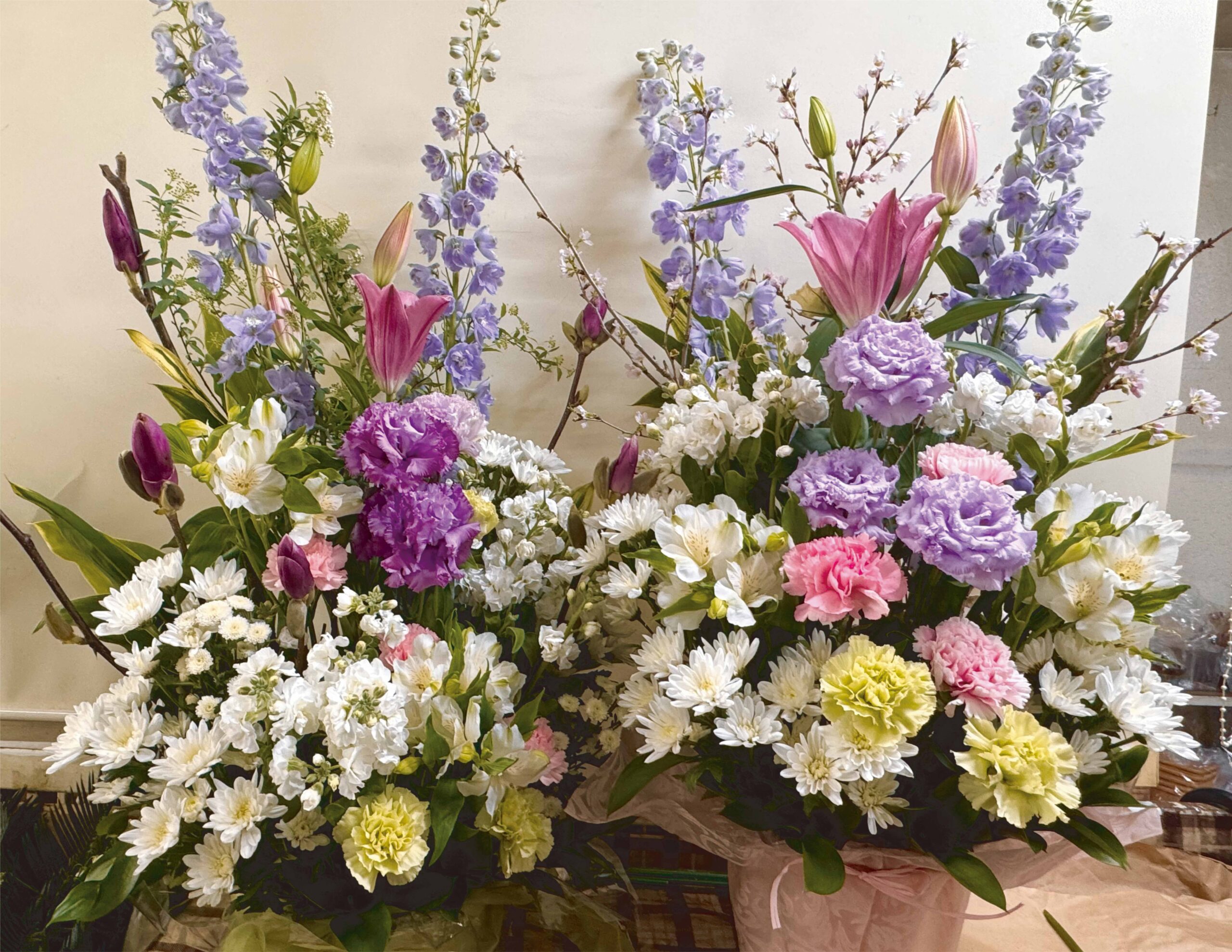 花の山城屋家族葬や法要などのご供花に、心を込めたアレンジメントを承ります。ご予算は3,000円〜10,000円が中心。3,000円以上で市内配達も可能です。色合いやお花のご希望に合わせて、丁寧にお作りいたします。