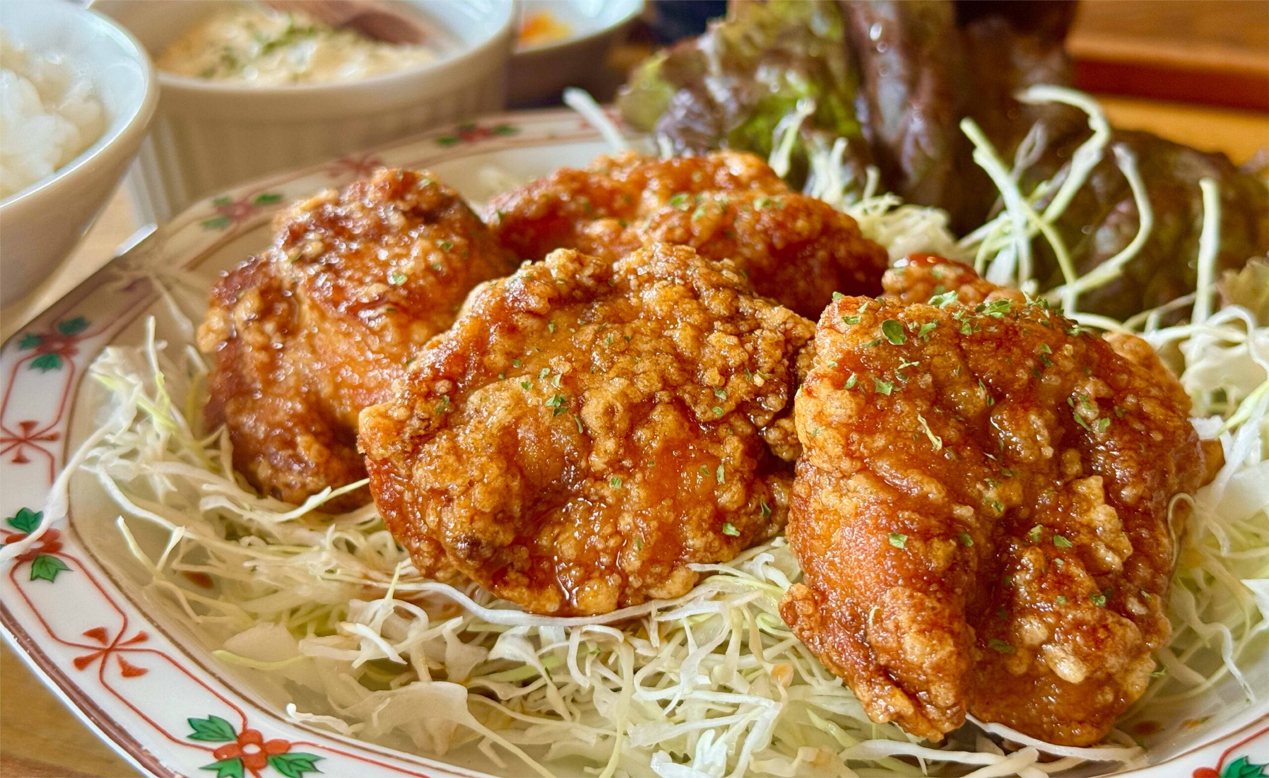 黒酢と黒糖のタレにしっかり付け込まれたチキンが旨い!自家製タルタルソースをたっぷりつけていただきます。定食のほか、単品(1,150円)もあるので、人気のジャンボ餃子と一緒にいかがですか?