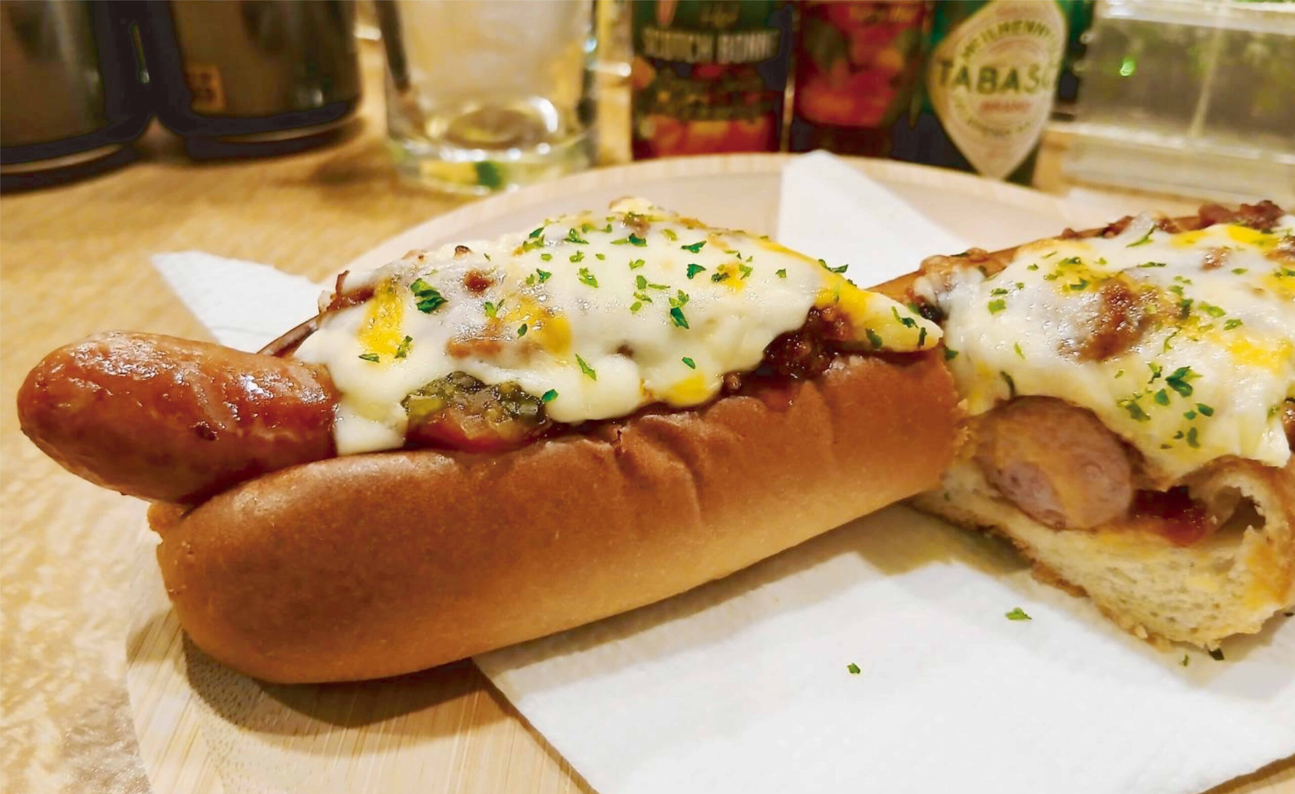 弱火で丁寧に煮込んだ自家製チリミートビーンズ(ひよこ豆)とバッチリ焼き上げた粗挽きソーセージのマリアージュ♪旨いに決まってます! 冷えたビールで、いってらっしゃい~☆☆☆